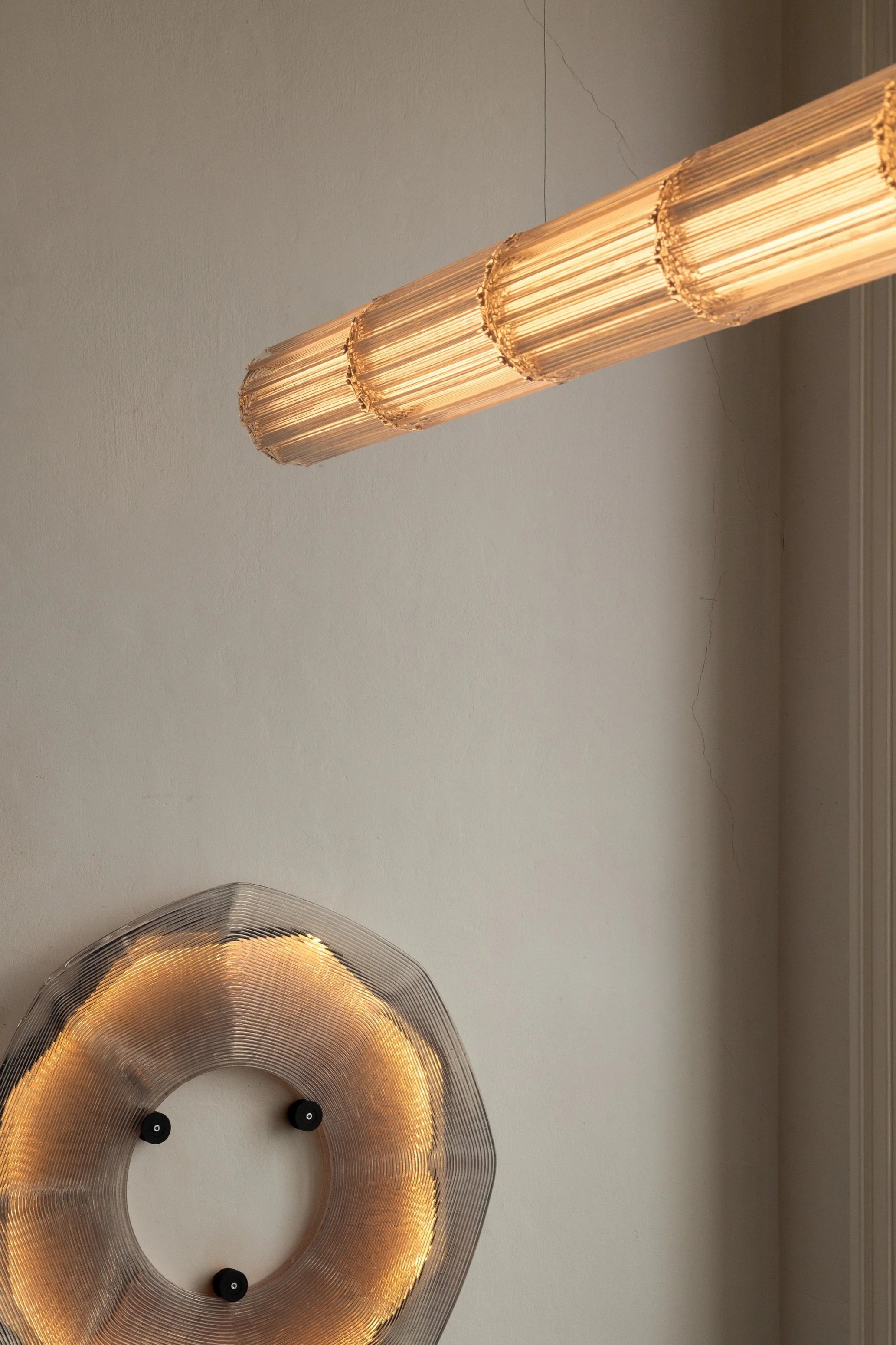 Printed in a transparent, glass-like recycled polymer, every cylinder follows the flow of the geometry. The layers soften the light and stretch it across the form, creating a quiet rhythm that changes as you move around it.